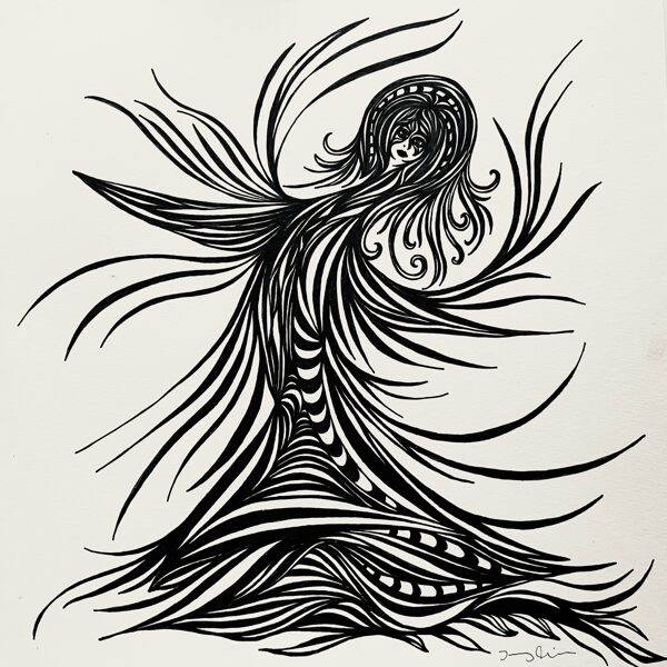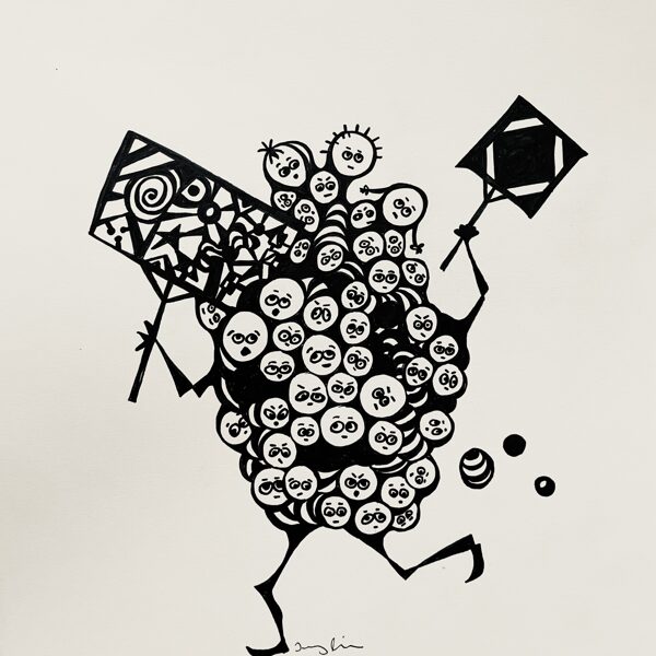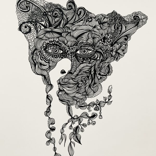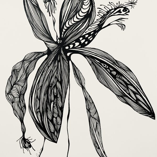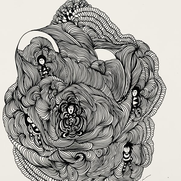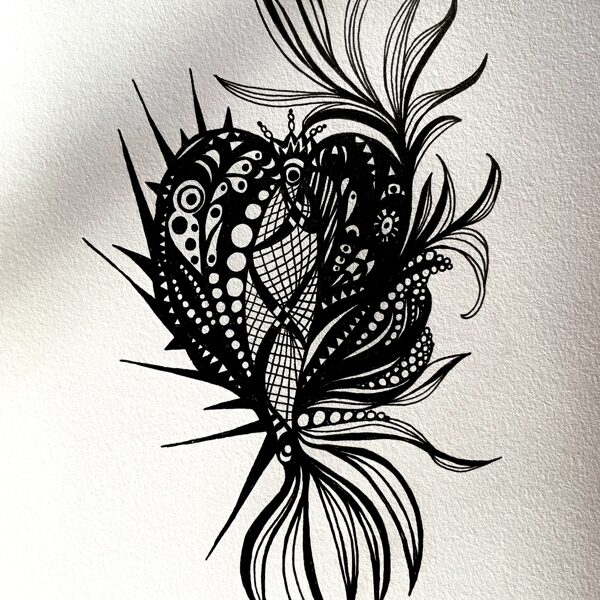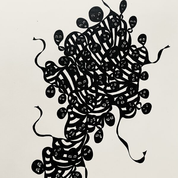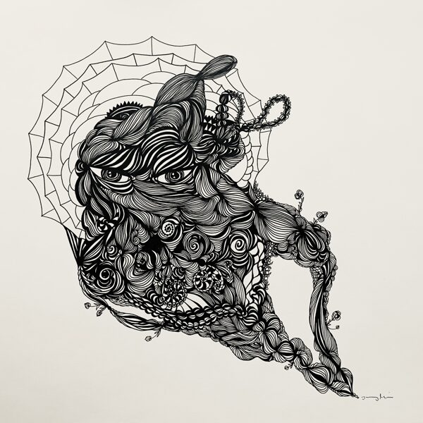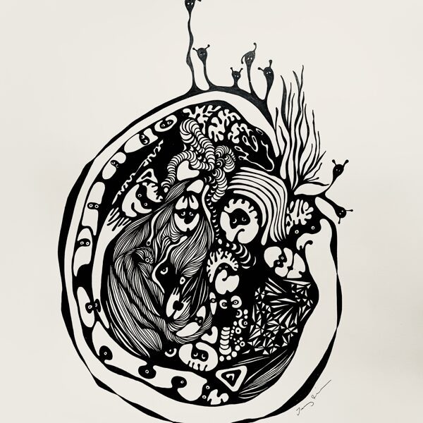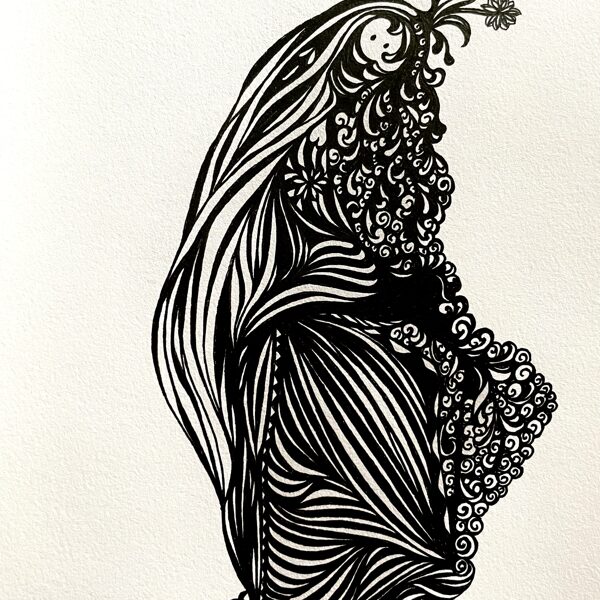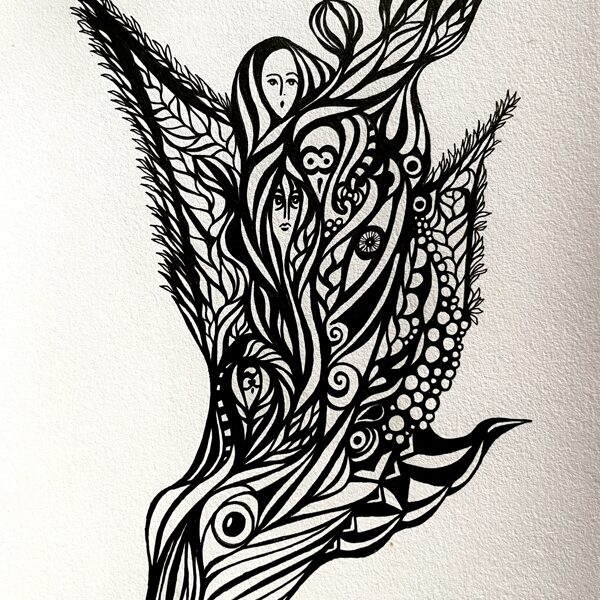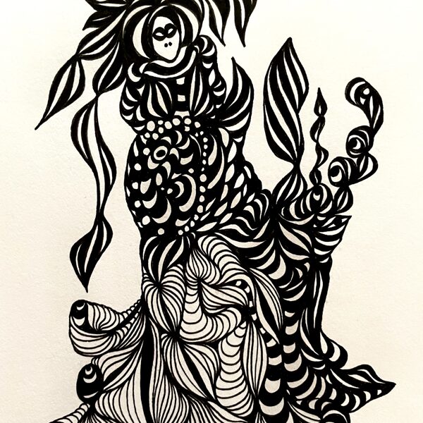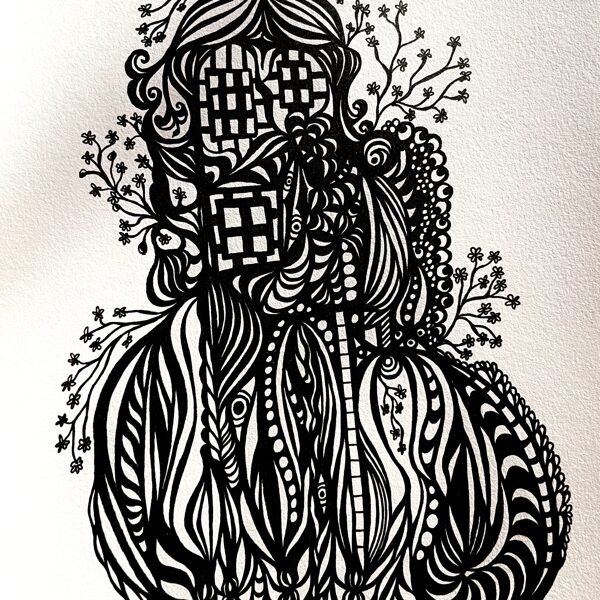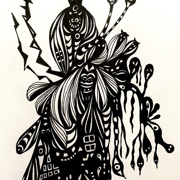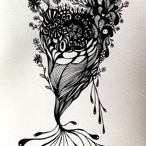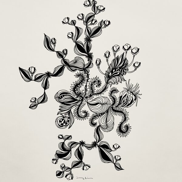Teckningarna är i tusch och storleken varierar, allt från små miniatyrer till 50 x 50 cm.